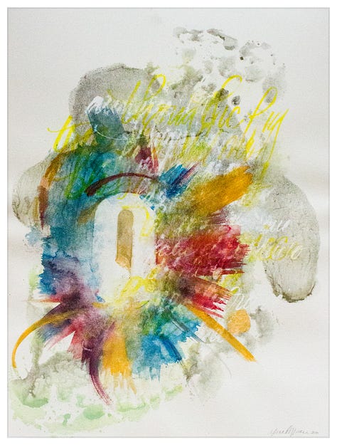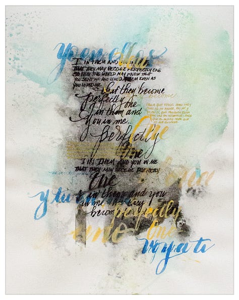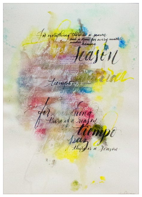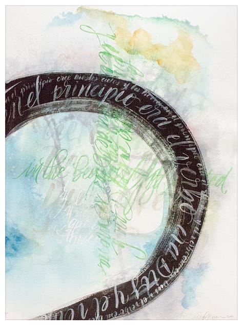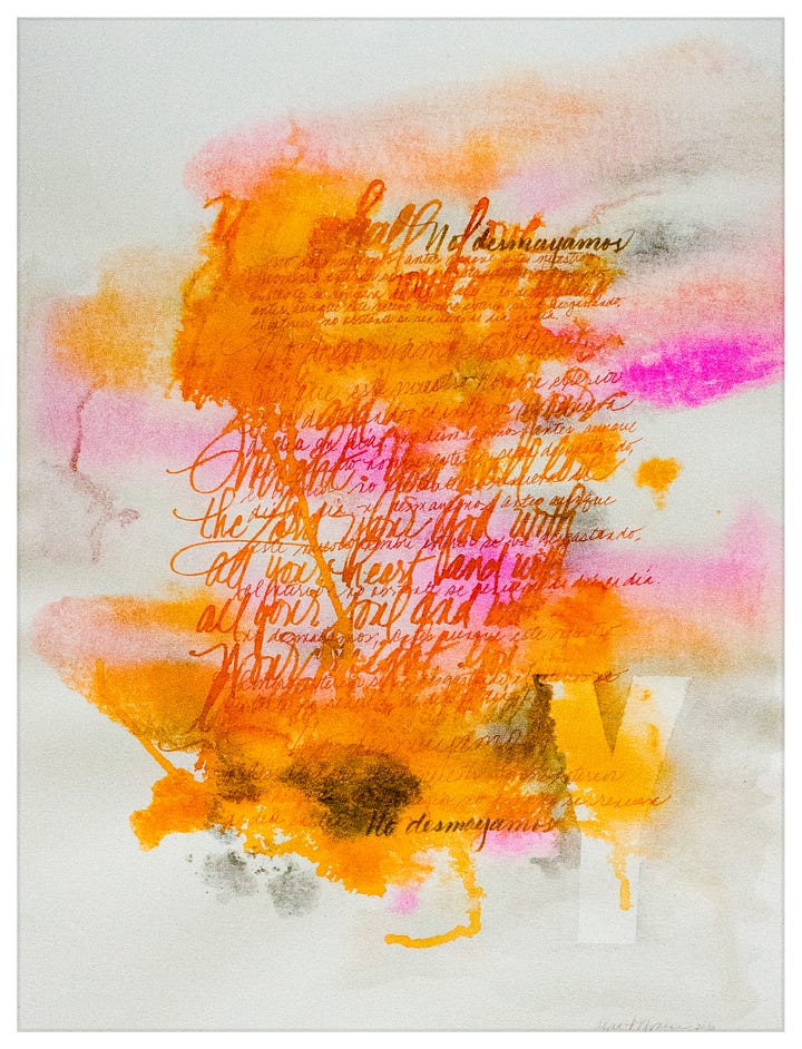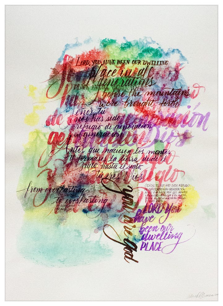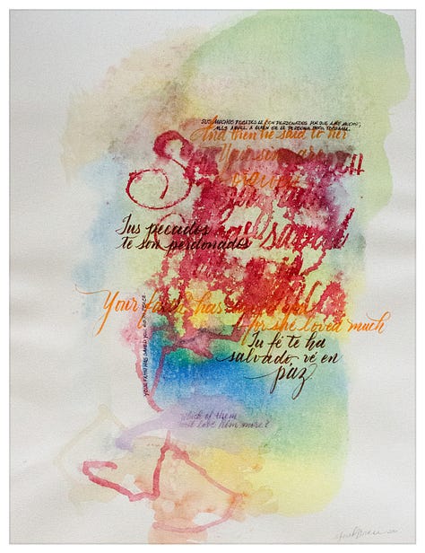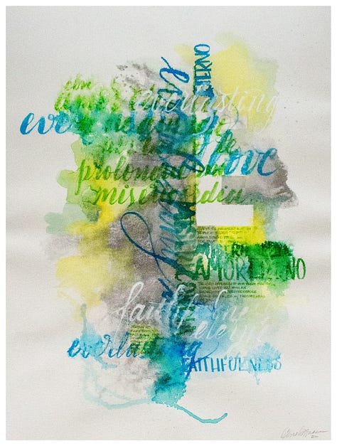 Several years ago, I created a series of watercolor pieces using lettering and calligraphic texture in Spanish and English. The show was called Visual Prayer. Each piece was a prayer using verses from the Bible in both languages. Each piece had a negative letter. All together it spelled YOU ARE LORD. I do not have photos of all of the pieces but you can see selected pieces below.